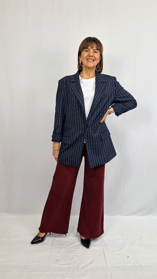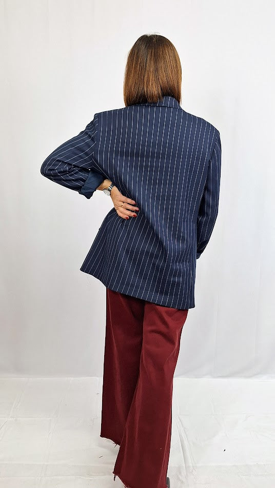 Il blazer "Gessato Over" si distingue per il suo taglio sartoriale impeccabile, caratterizzato da un classico reverse e una chiusura con un solo bottone. Realizzato in un elegante tessuto blu gessato, questo capo presenta maniche con spalline che ne valorizzano la struttura e una fodera interna che garantisce comfort e una vestibilità ottimale. Un capo raffinato ideale per chi cerca uno stile formale ma contemporaneo.