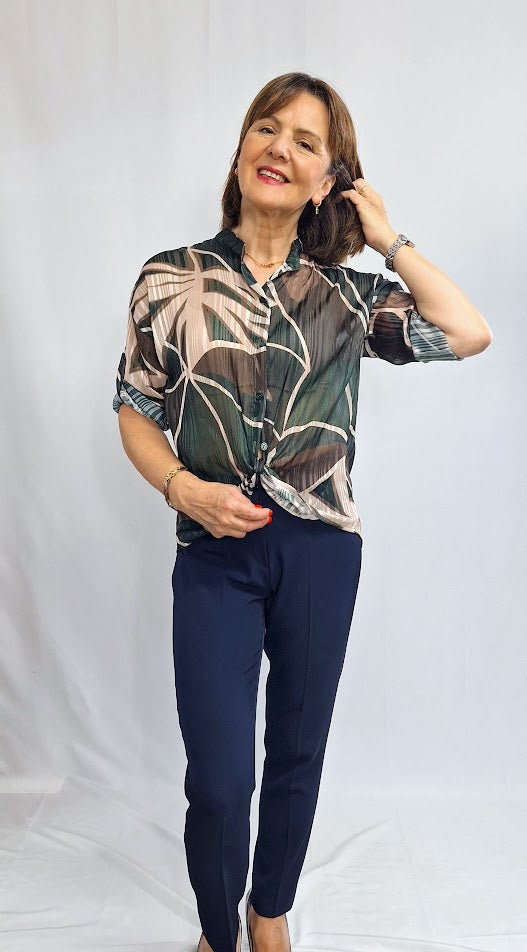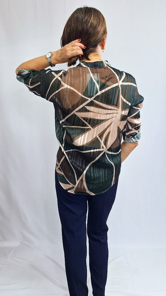 La camicia "Aurora" è realizzata in morbido chiffon, caratterizzata da un collo coreano elegante e una fantasia astratta arricchita da un leggero filo lurex che dona un raffinato tocco luminoso. Le maniche lunghe offrono praticità e stile, con la possibilità di essere legate grazie a un bottoncino, per un look versatile e curato in ogni dettaglio. Perfetta per chi cerca un capo sofisticato e leggero, adatto a diverse occasioni.