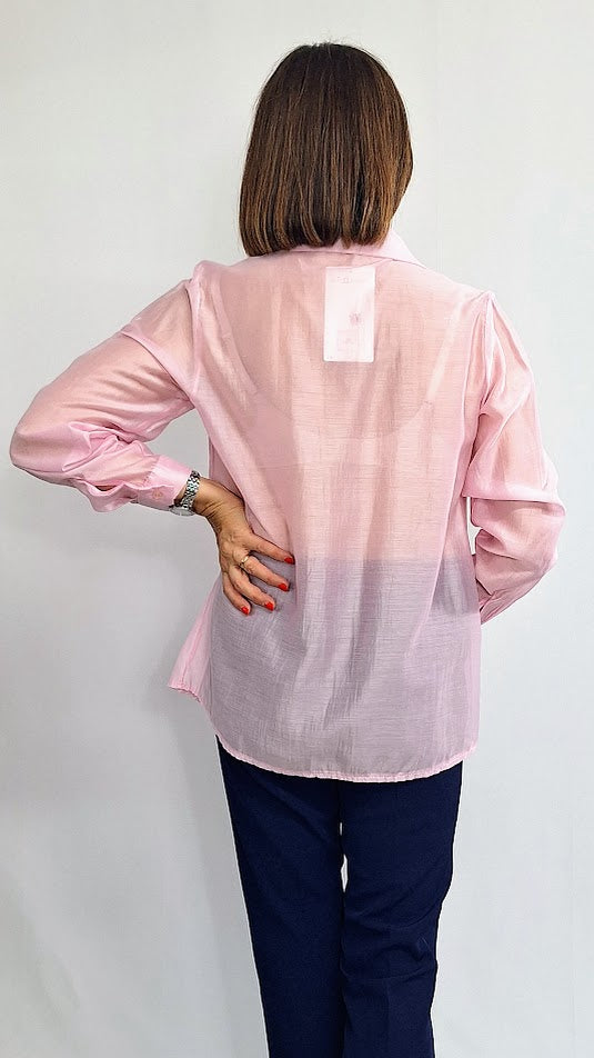 la Camicia Chloe, un capo essenziale per il tuo guardaroba, disponibile in un delicato rosa e in un classico bianco. Realizzata in un tessuto leggero e semi-trasparente, regala un tocco di eleganza e leggerezza a ogni tuo look.