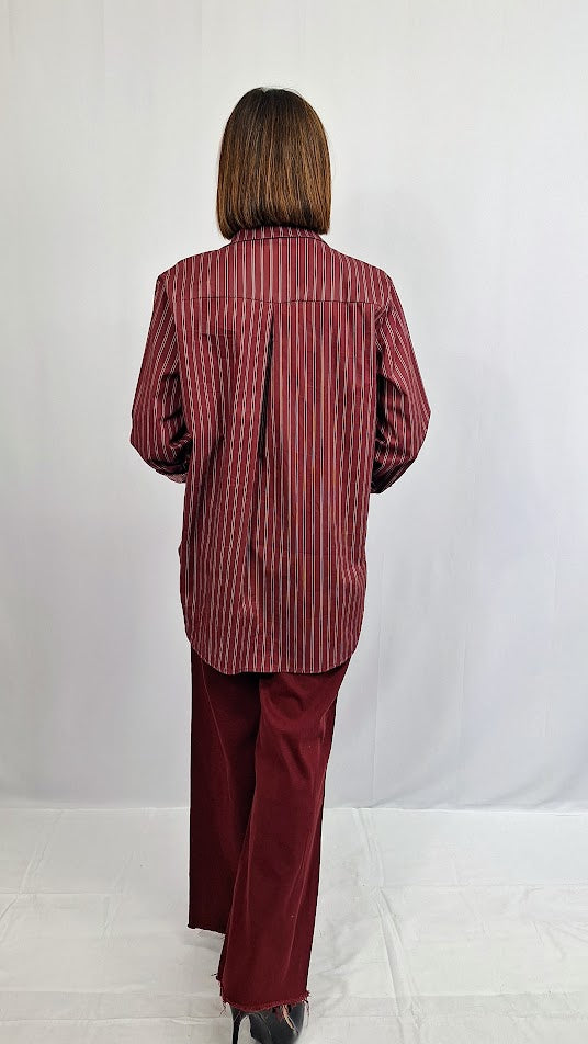 Questa camicia oversize in cotone, "Clementina righe", presenta un design moderno con righe a contrasto e una lunghezza maggiore sul retro per un look contemporaneo. Il collo a camicia tradizionale e i polsini corti da 3 cm offrono un comfort raffinato, mentre le righe interne conferiscono un dettaglio di stile unico e discreto. Perfetta per chi cerca un capo versatile che unisce praticità e carattere.