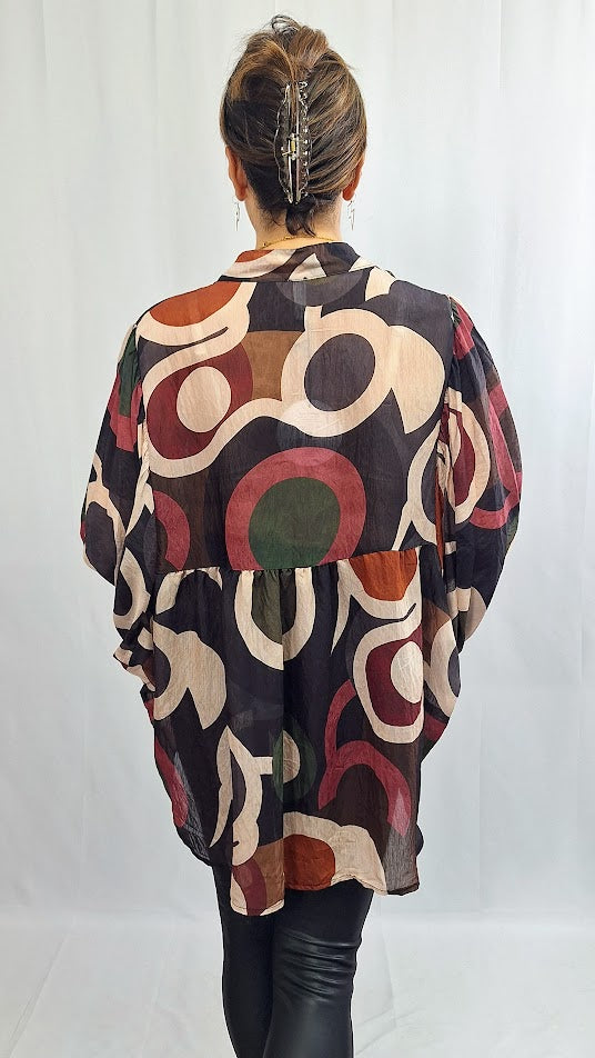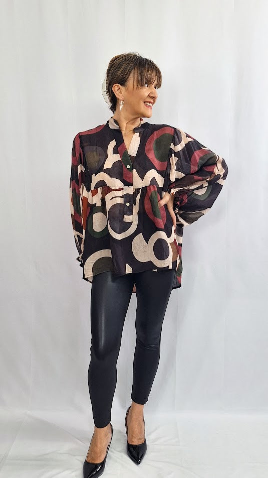 La stampa geometrica multicolore su base scura la rende un capo versatile, perfetto da abbinare a leggings, pantaloni skinny o jeans per look casual chic o più eleganti.