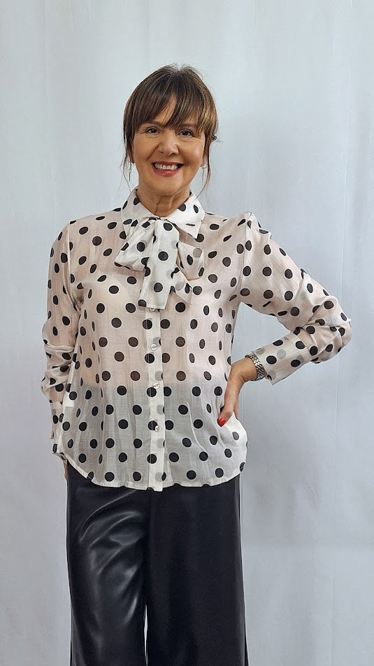 Questa camicia in tencel si distingue per la sua morbidezza eccezionale e l’elegante fantasia a pois. Il colletto a camicia arricchito da un fiocco aggiunge un tocco raffinato, mentre le maniche lunghe con polso alto conferiscono stile e struttura. Il dettaglio tecnico del piegone posteriore garantisce una vestibilità ottimale e confortevole, ideale per un look sofisticato senza rinunciare al comfort.