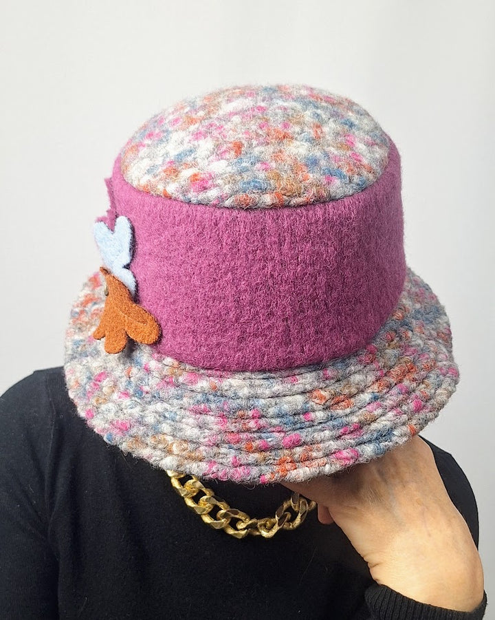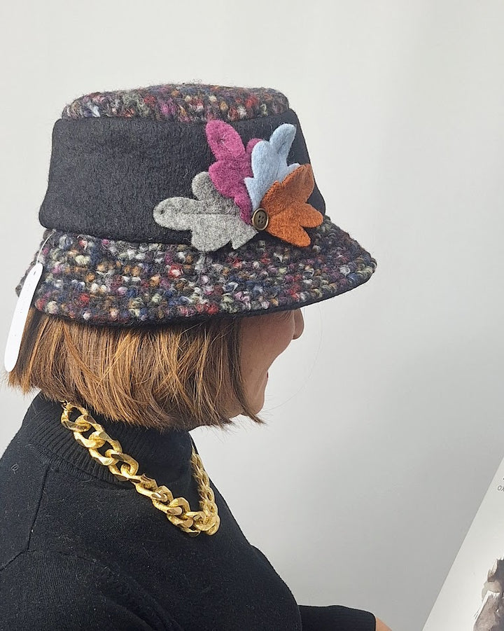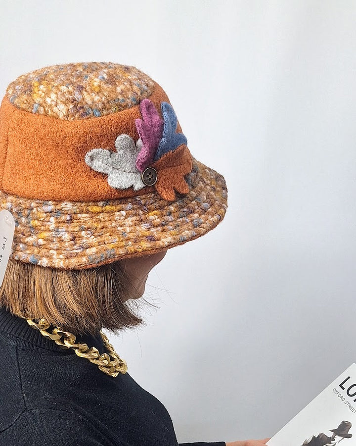 Cappello in misto lana lavorato a maglia con effetto bouclé che regala una texture riccia e tridimensionale. Il tessuto, morbido e isolante, avvolge il capo senza stringere né appiattire, garantendo comfort durante le giornate fredde. La decorazione laterale in feltro con foglioline colorate aggiunge un tocco di personalità e luminosità, trasformando un accessorio funzionale in un dettaglio di stile consapevole. Una scelta raffinata per chi apprezza la qualità costruttiva e i materiali nobili.