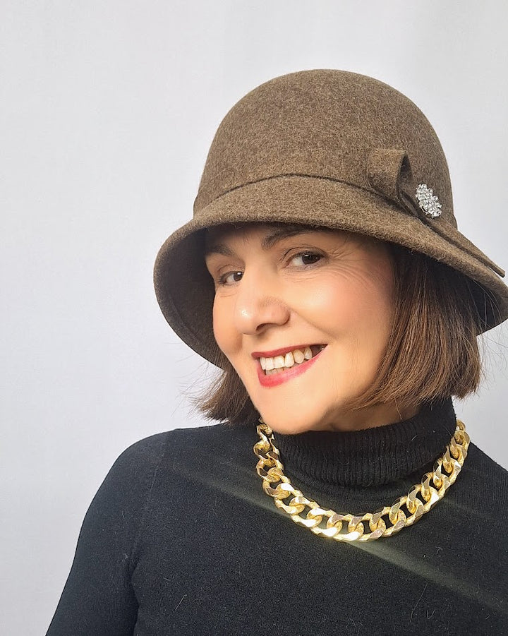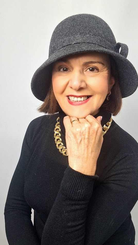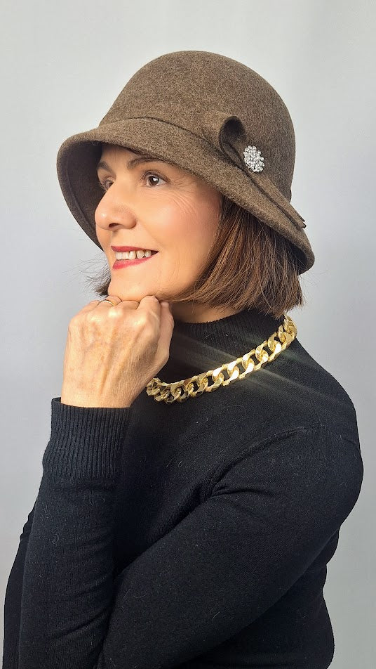 Il Cappello Cloche "Isabella" in feltro di pura lana vergine ha la cupola arrotondata e profonda che avvolge la testa con comfort naturale, mentre la falda corta e spiovente incornicia il viso con proporzioni raffinate.Il cappello è impreziosito da una spilla gioiello con cristalli che simulano diamanti, montata in design floreale o a stella. Un accessorio che unisce autenticità storica e dettagli contemporanei, perfetto per chi apprezza lo stile vintage con una nota di lusso.