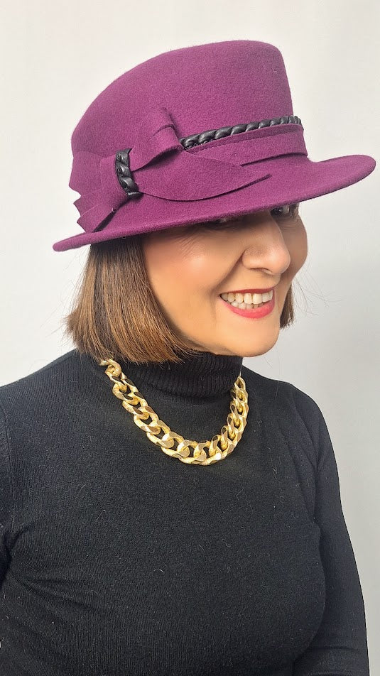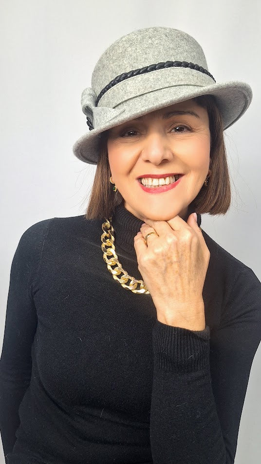 Cappello Cloche "Eleonora" in pregiato feltro di pura lana, che garantisce calore, morbidezza e una struttura impeccabile. Il modello presenta una cupola cilindrica e piatta ispirata al classico Bombetta, reinterpretata in feltro invernale e bilanciata da una falda media, dritta e ben definita, che incornicia il viso con effetto scenografico. La guarnizione gioca su contrasti affascinanti: un nastro intrecciato in simil-pelle nera aggiunge un elemento rock-chic al mood classico, mentre il fiocco piatto in feltro dello stesso cappello rappresenta un dettaglio sartoriale sofisticato che modella la forma con eleganza.