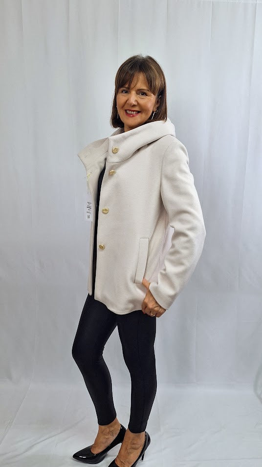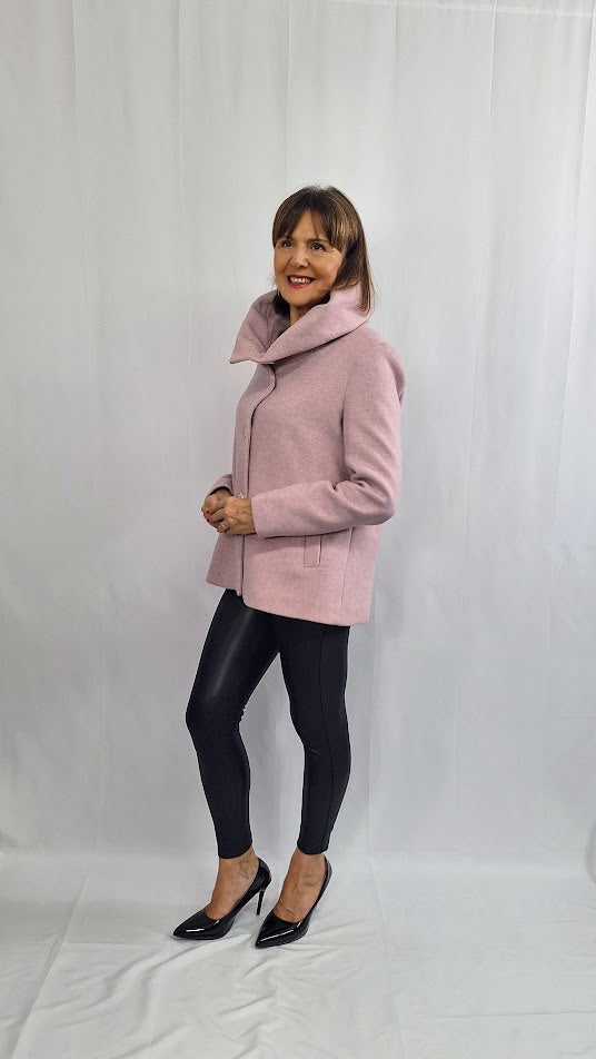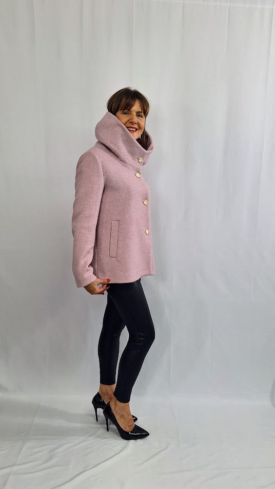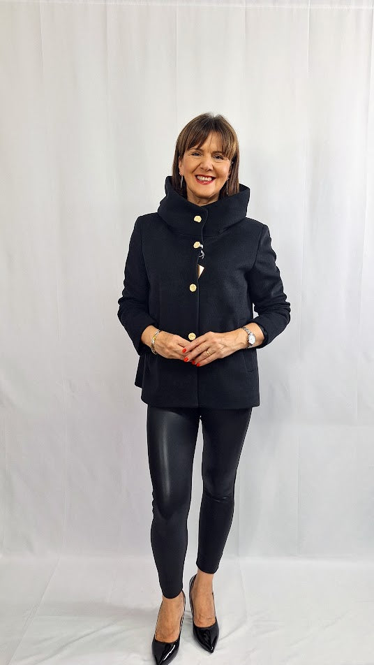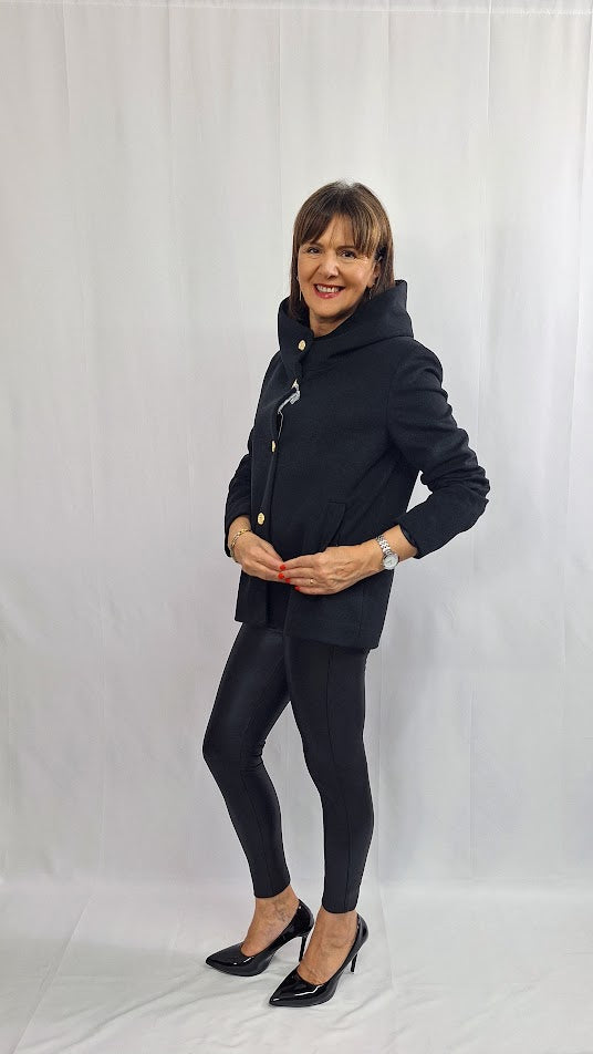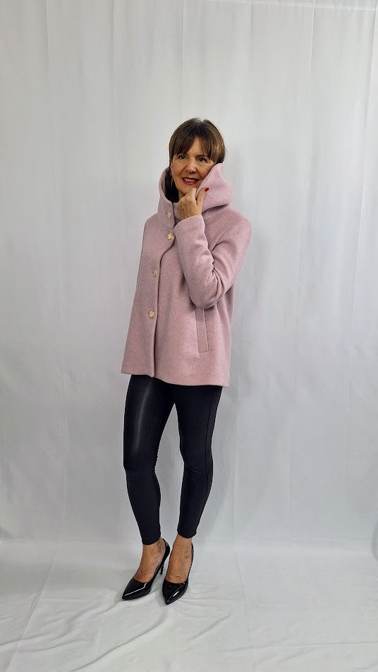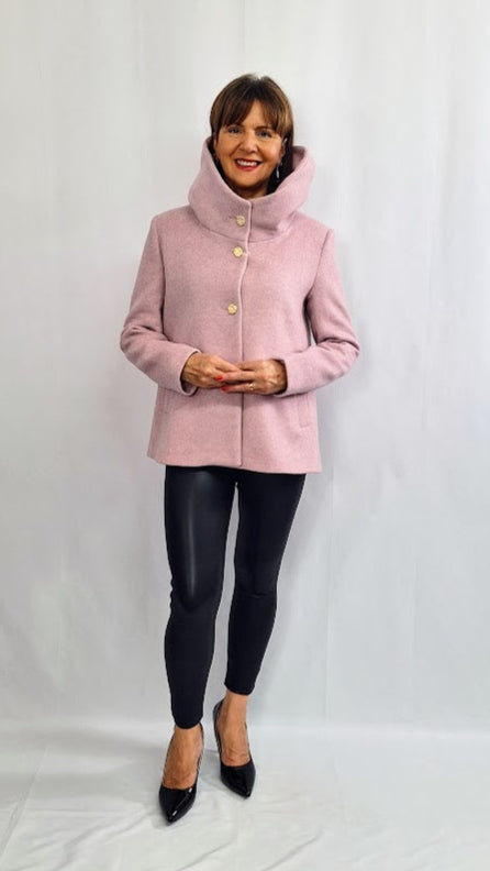 La cappetta "Lila" in un morbidiissimo tessuto caldo unisce eleganza e funzionalità. Il collo alto stile coreano, che si trasforma in un effetto cappuccio, protegge dal freddo con stile. Dotata di pratiche tasche e completamente foderata, garantisce comfort e calore, ideale per affrontare le giornate più fresche con un tocco raffinato.