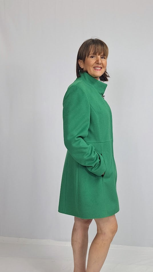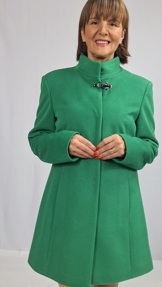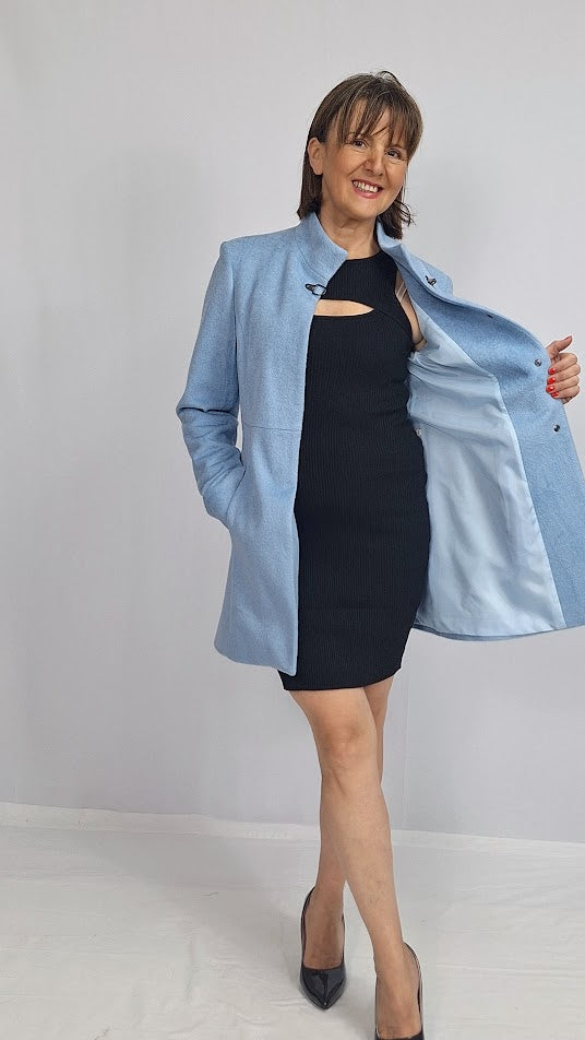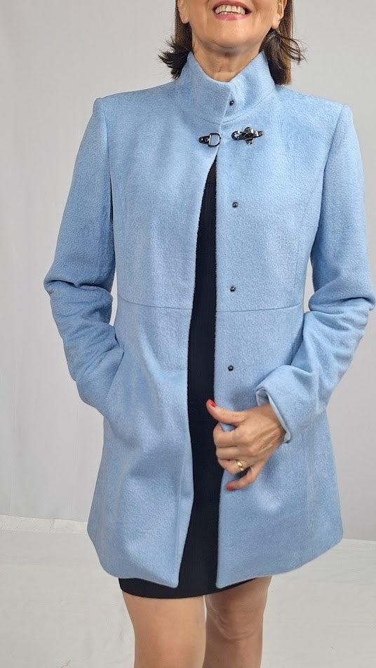 Il cappotto "Mod.Fay" unisce eleganza e praticità con il suo taglio al ginocchio e il collo alla coreana caratteristico e raffinato. Dotato di abbottonatura a scomparsa e tasche funzionali, offre un design sobrio e curato. Completamente fodera .Il tessuto in misto lana garantisce morbidezza e calore, ideale per affrontare le giornate più fredde con stile e comfort.