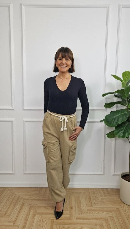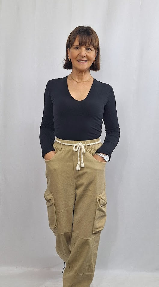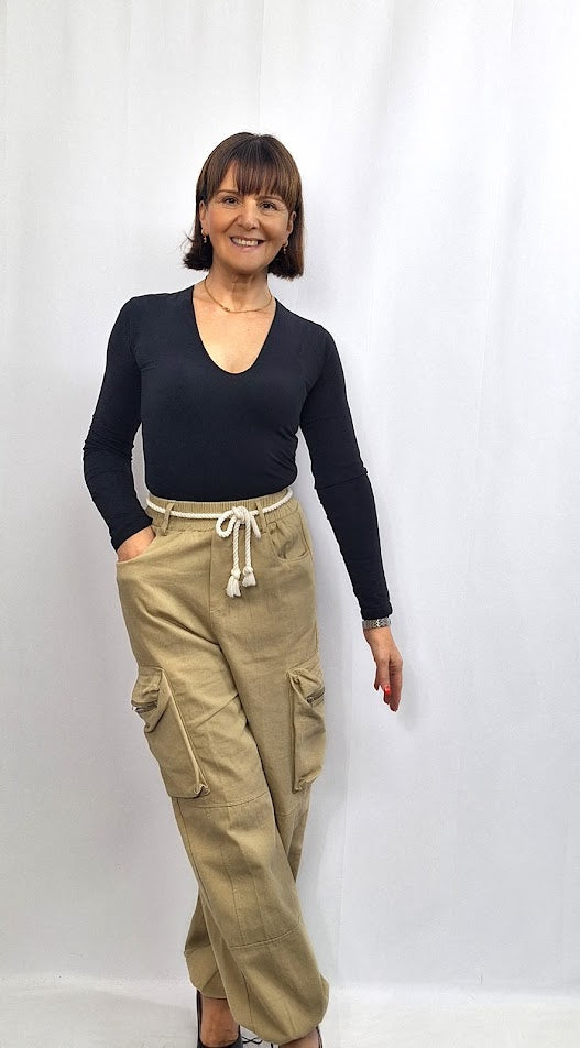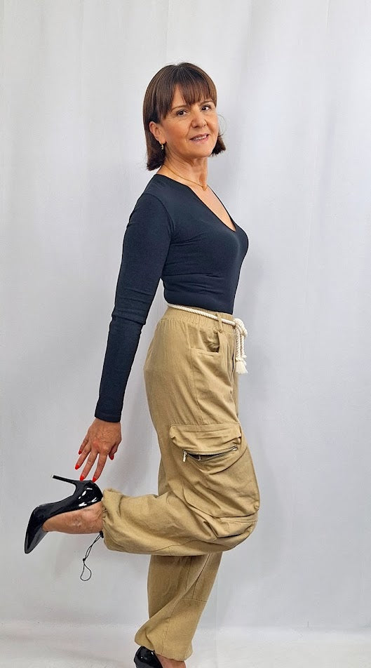 Il Cargo "Mia" è realizzato in un cotone corposo ma morbido, che garantisce comfort e resistenza. La vita elastica assicura una vestibilità adattabile, mentre le tasche all'americana (tasca obliqua) e i capienti tasconi con zip offrono praticità e sicurezza per gli oggetti personali. La coulisse sul fondo permette di regolare la larghezza, donando versatilità allo stile. Taglia unica, progettata per adattarsi anche a chi preferisce un fit over, unendo funzionalità e design contemporaneo.