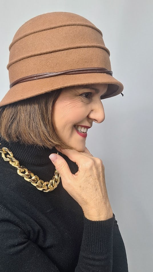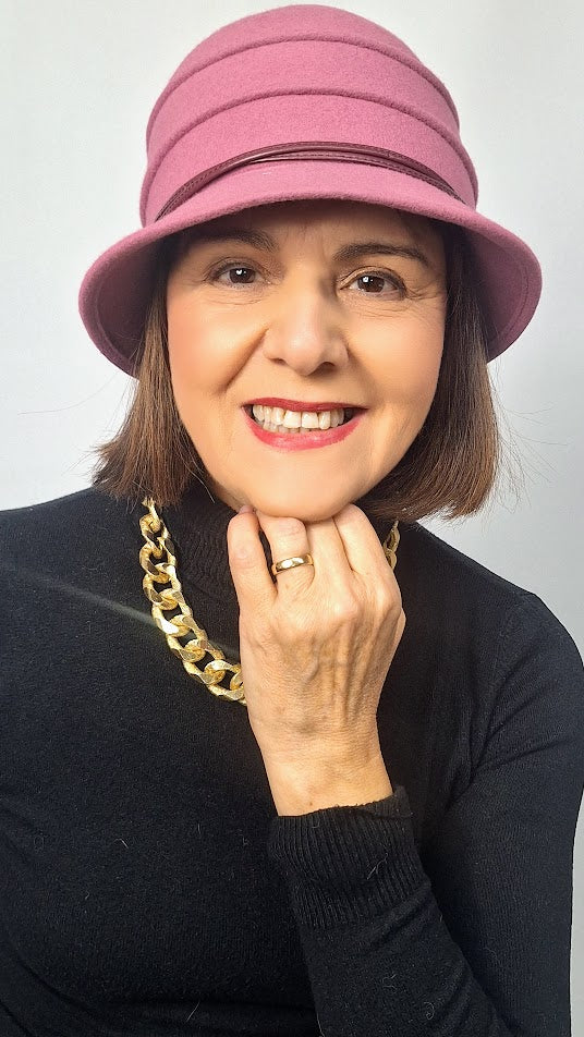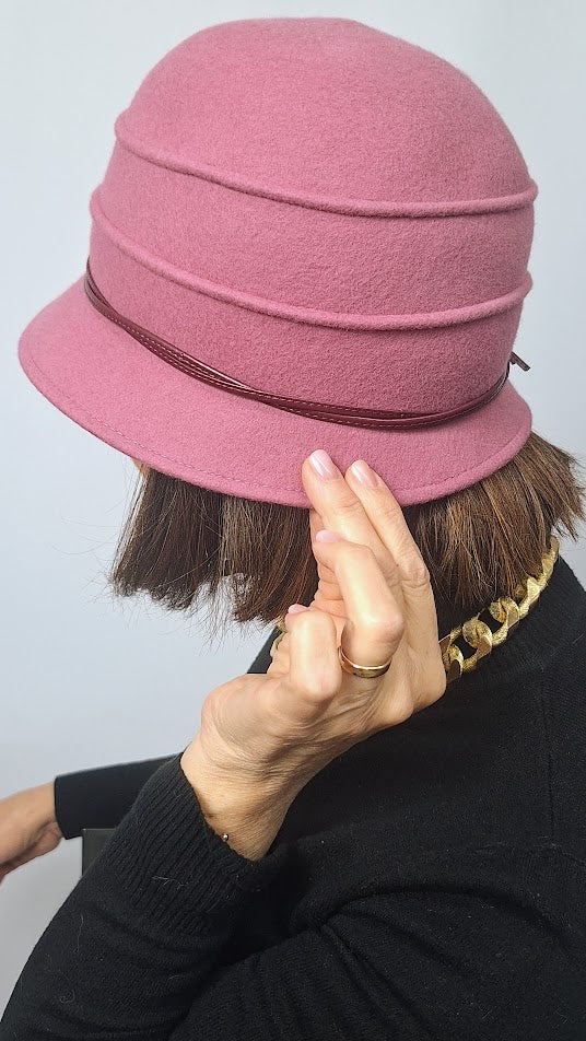 Cappello Cloche "Matilde" in feltro di lana con cupola arrotondata e profonda, impreziosito da fasce concentriche in rilievo che seguono il girotesta. Dettaglio distintivo: nastro in similpelle annodato frontalmente con elegante fiocco decorativo. Un accessorio che reinterpreta lo stile vintage con raffinatezza contemporanea, perfetto per chi ricerca un tocco sofisticato e caratterizzato. Ideale per completare look classici con personalità.