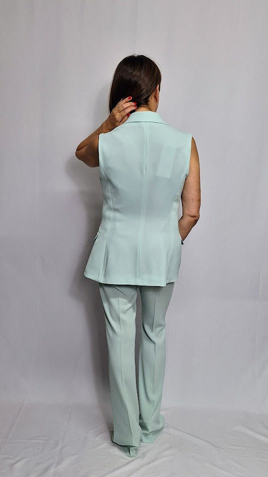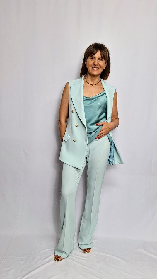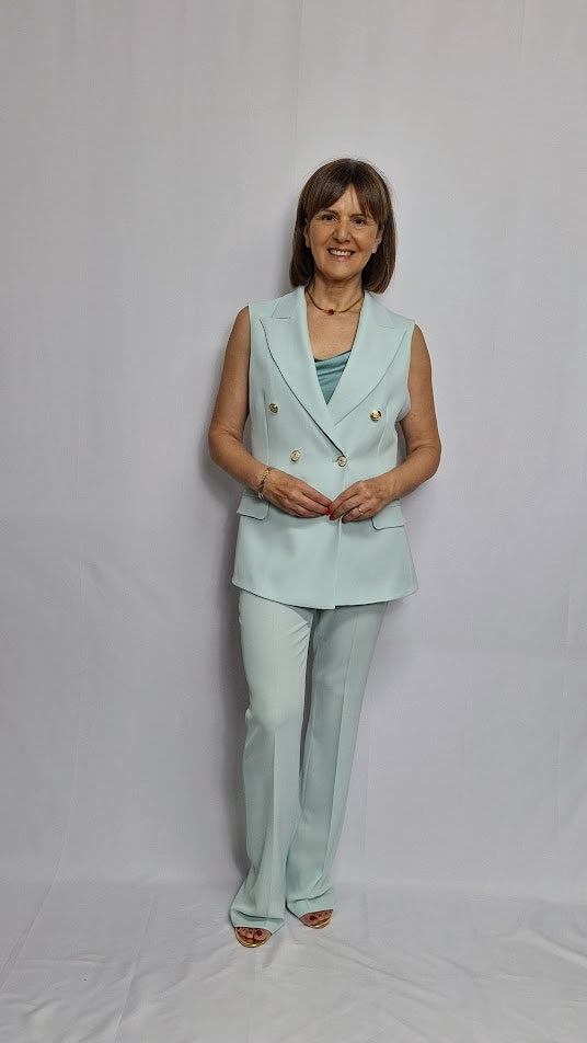 Il completo "Arianna" presenta una giacca smanicata con petto a lancia rifinito con cura sartoriale e abbottonatura doppio petto, arricchita da tasche con pattina per un dettaglio elegante e funzionale. Il pantalone, leggermente ampio, è dotato di zip e bottone frontali, privo di tasche per un design pulito. Realizzato in morbido tessuto cadi, offre comfort e una vestibilità raffinata, ideale per chi cerca un equilibrio tra stile e praticità.