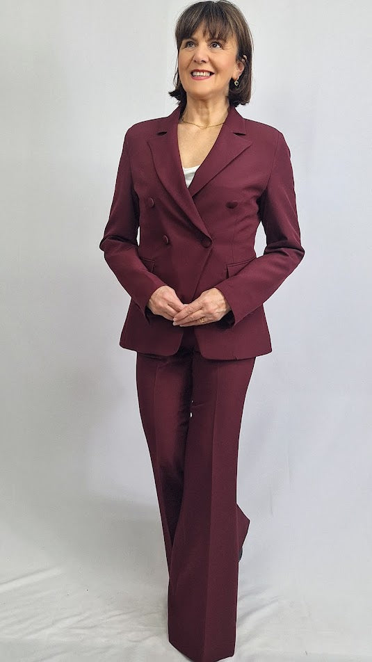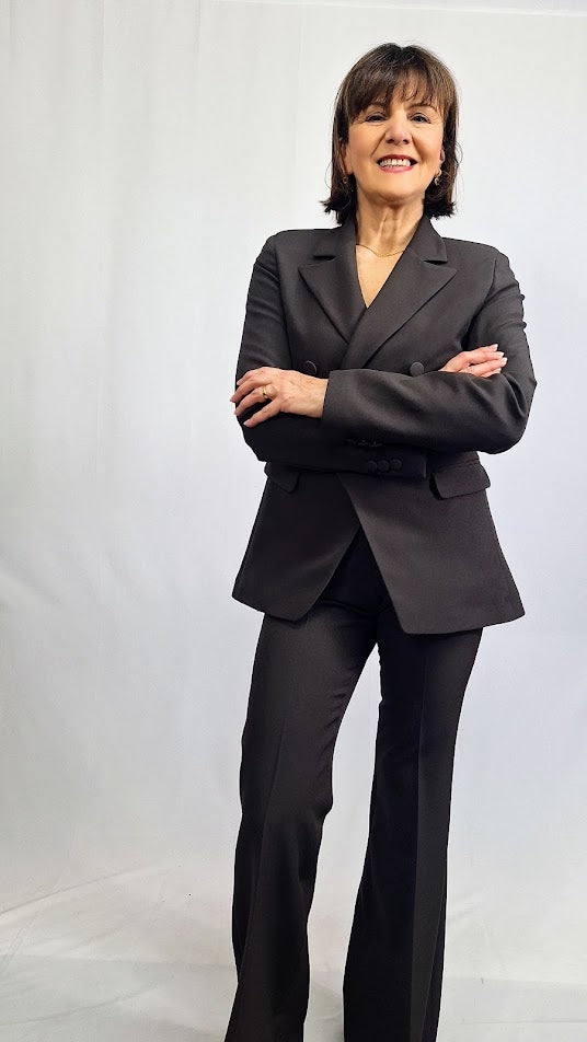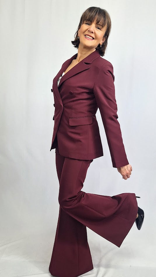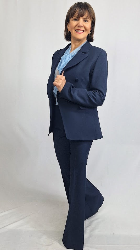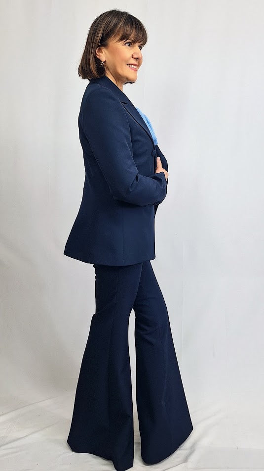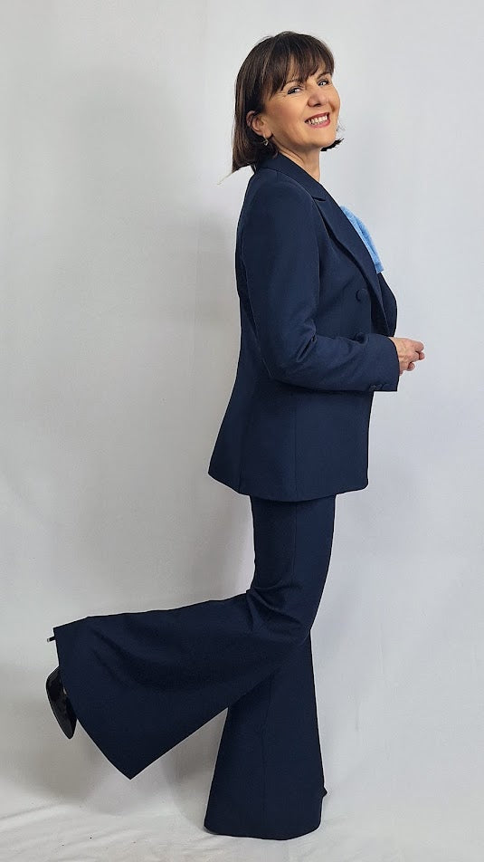 Completo sartoriale Rita dalla silhouette impeccabile e raffinata. La giacca doppio petto con chiusura a un solo bottone garantisce eleganza sobria e versatile, mentre la vestibilità slim fit valorizza la figura. Il reverse classico, rifinito con cura artigianale, assicura una qualità costruttiva superiore. Il pantalone vita alta con bustino interno offre comfort e stabilità, completato dalla zip laterale per una vestibilità ottimale. La gamba a zampa conclude il design con un tocco di carattere senza tempo. Perfetto per chi ricerca un capo di qualità sartoriale.