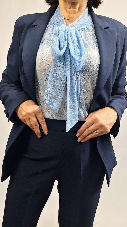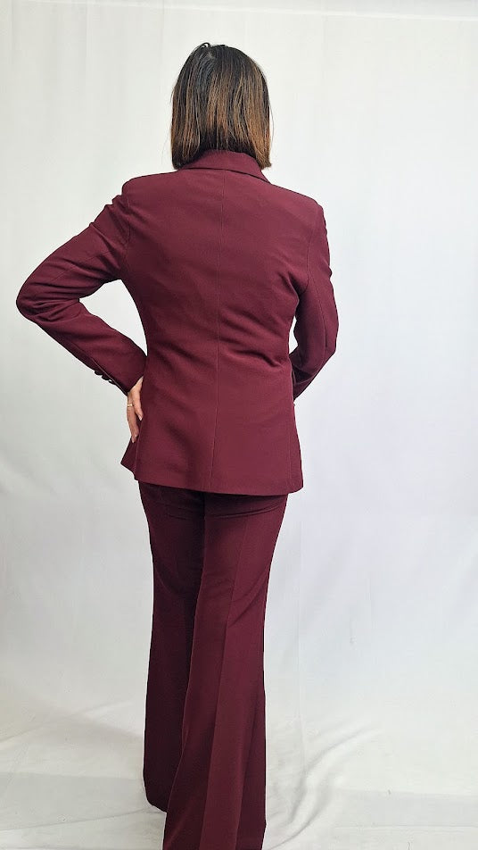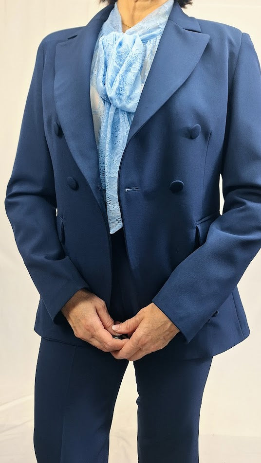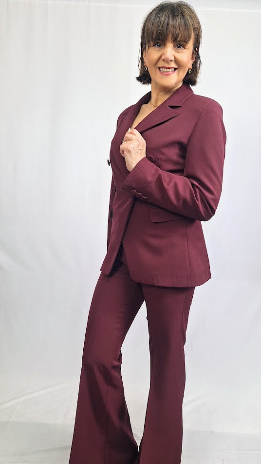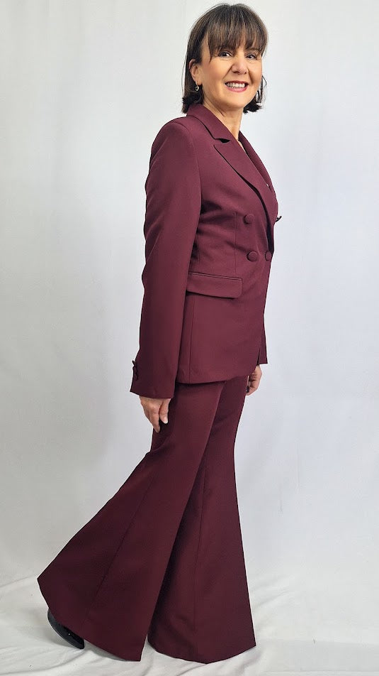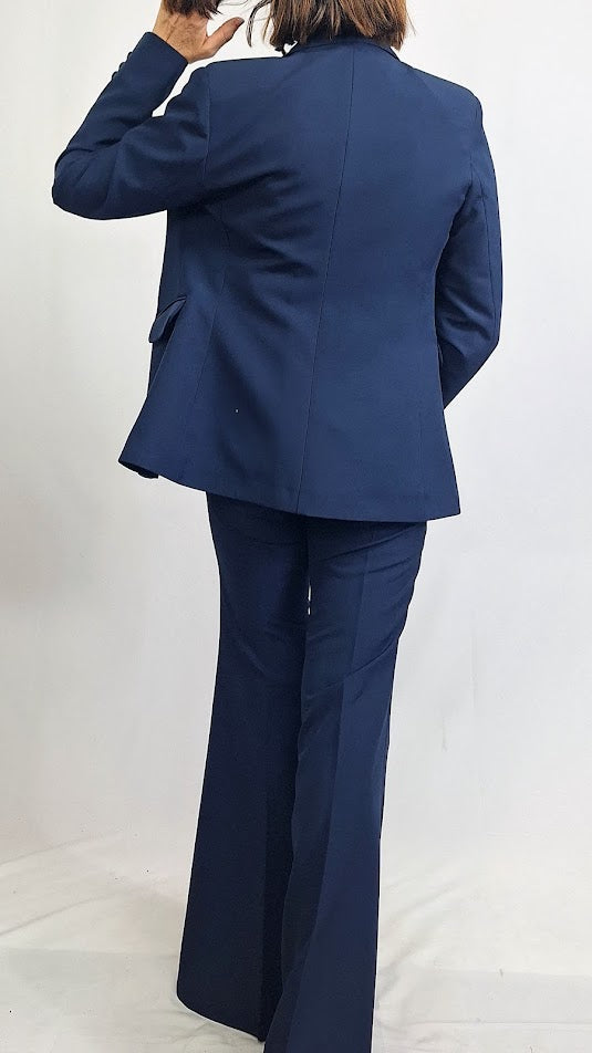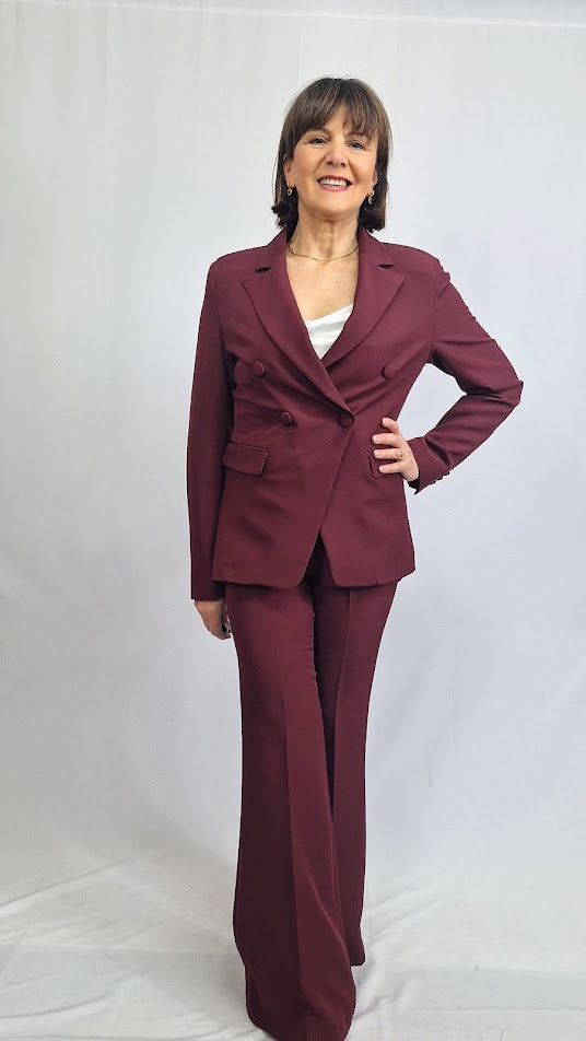 Completo sartoriale Rita dalla silhouette impeccabile e raffinata. La giacca doppio petto con chiusura a un solo bottone garantisce eleganza sobria e versatile, mentre la vestibilità slim fit valorizza la figura. Il reverse classico, rifinito con cura artigianale, assicura una qualità costruttiva superiore. Il pantalone vita alta con bustino interno offre comfort e stabilità, completato dalla zip laterale per una vestibilità ottimale. La gamba a zampa conclude il design con un tocco di carattere senza tempo. Perfetto per chi ricerca un capo di qualità sartoriale.