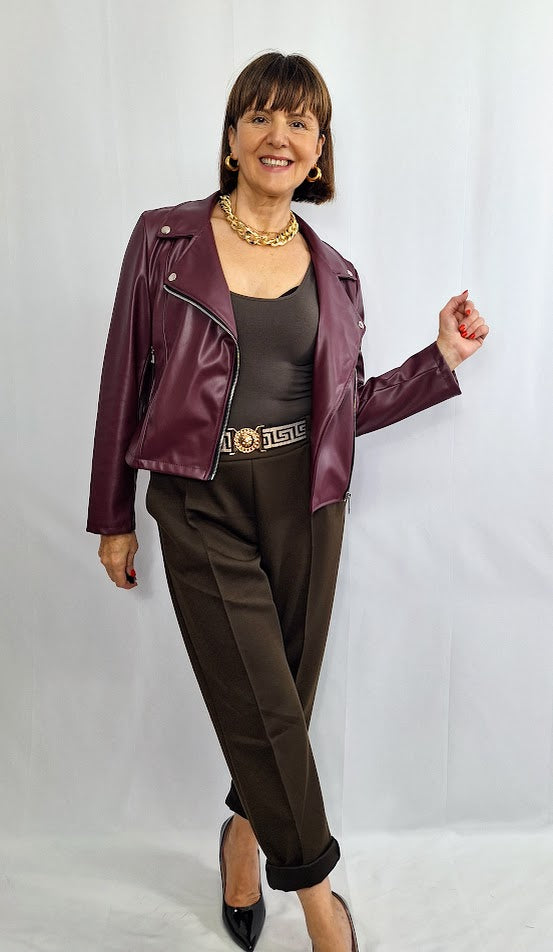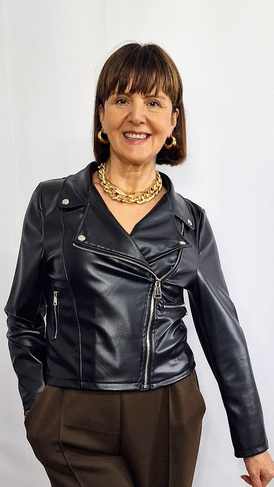 Questa giacca "Chiodo" in ecopelle ultra morbida unisce stile e comfort con un design sfoderato e un collo reverse ampio che valorizza la silhouette. La chiusura con zip leggermente laterale crea un elegante effetto doppio petto, mentre le tasche con zip aggiungono praticità senza rinunciare alla raffinatezza. Perfetta per chi cerca un capo di tendenza e versatile.