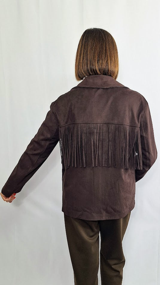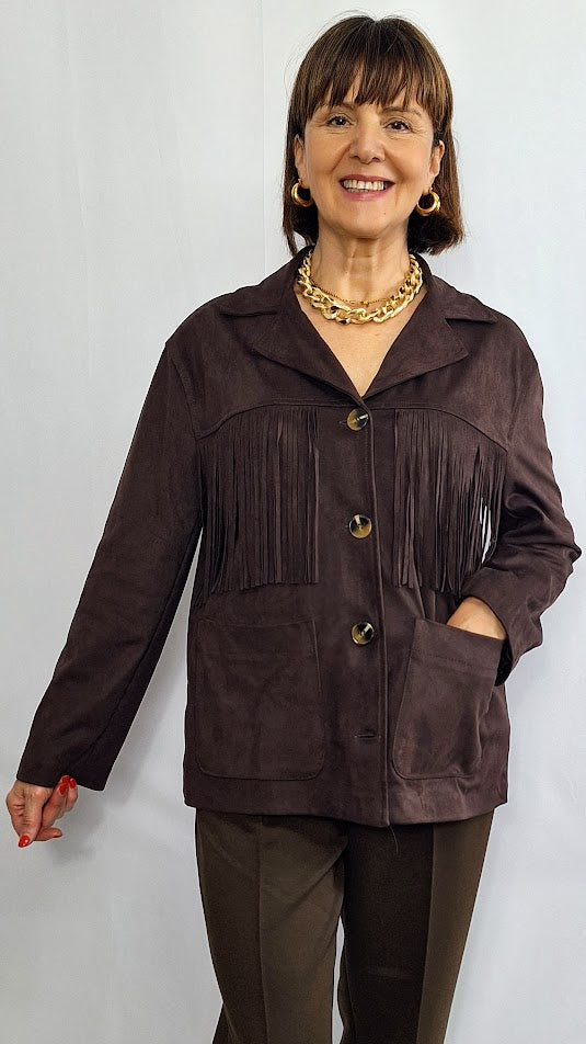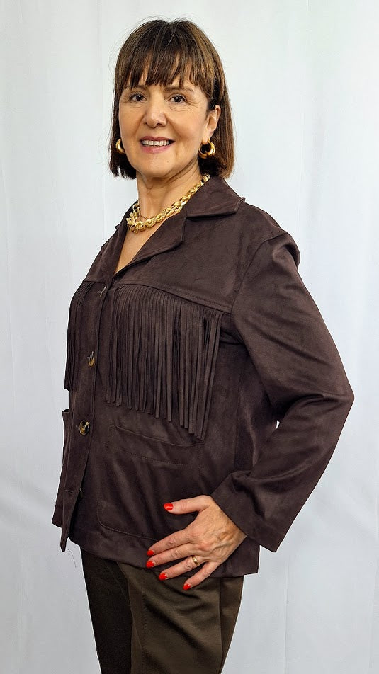 Questa giacca "Texas" in camoscio compatto unisce robustezza e stile autentico, impreziosita da bottoni in corozo dal carattere vintage. Le tasche a toppa e le frange sul davanti e sul retro richiamano l'iconico look da cowgirl texana, conferendo un fascino deciso e distintivo. Progettata per garantire una vestibilità confortevole anche alle taglie curvy, rappresenta un capo versatile e di grande personalità per arricchire qualsiasi guardaroba.