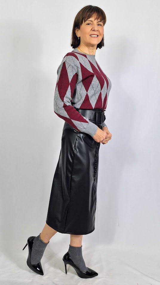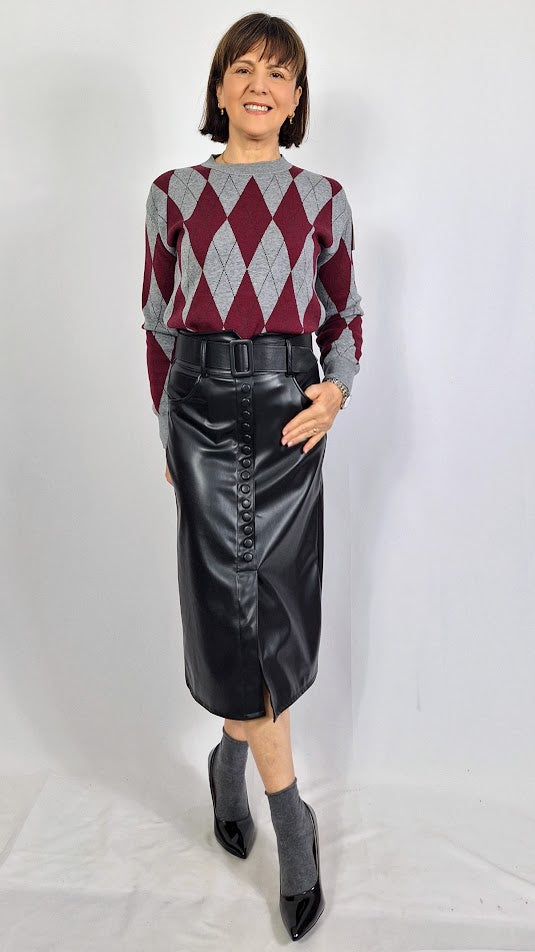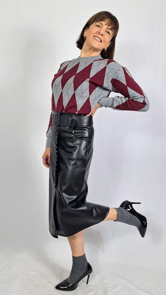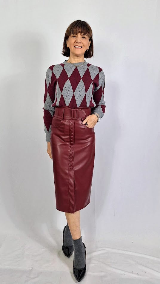 Gonna in ecopelle dal design essenziale e raffinato. La linea dritta e la lunghezza midi creano una silhouette elegante e versatile, perfetta per composizioni sofisticate. Lo spacco anteriore garantisce libertà di movimento, mentre i bottoni frontali decorativi aggiungono un dettaglio di carattere. Un capo versatile che si adatta facilmente a diversi stili, dal casual al più formale.