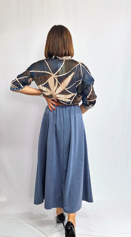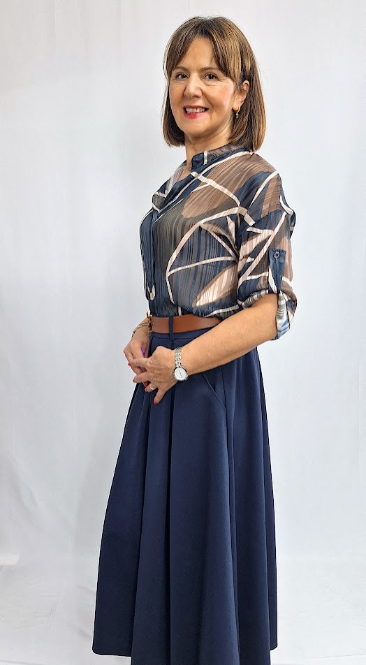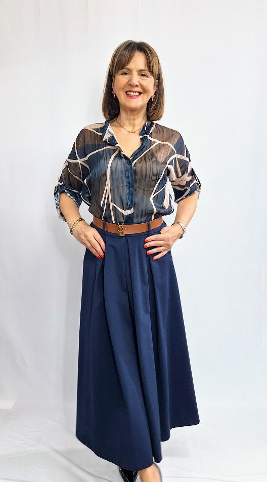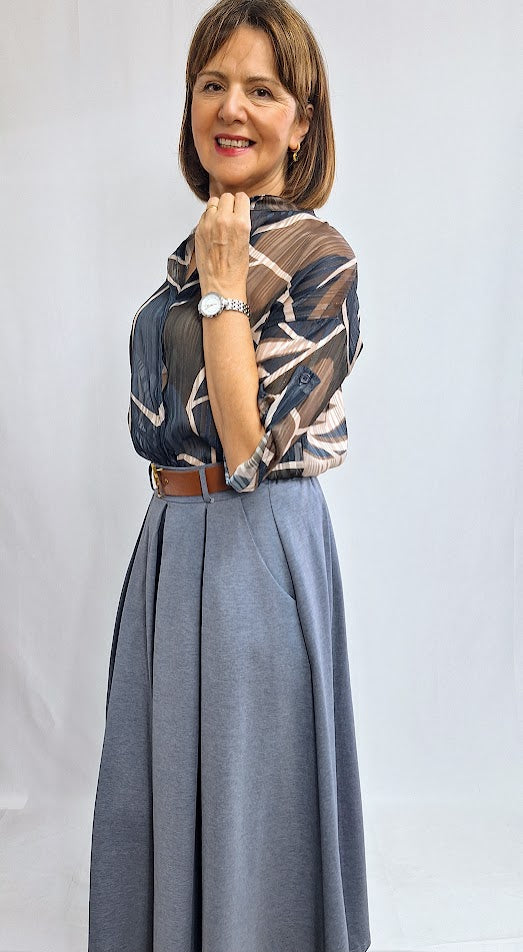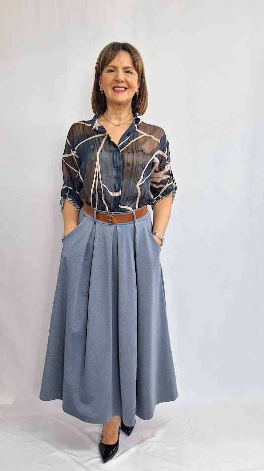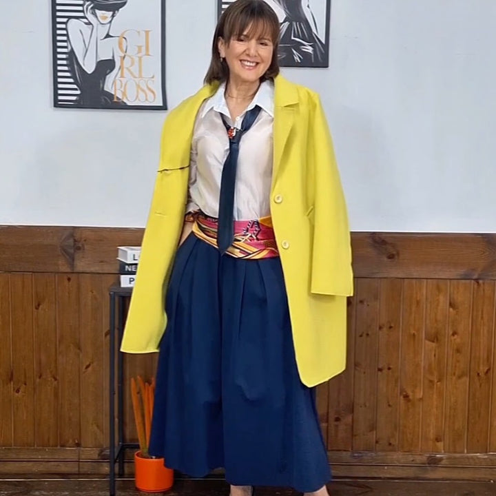 La gonna "Monique" è realizzata in un tessuto di cotone spesso, che garantisce struttura e comfort. Il modello presenta pieghe eleganti per un tocco di movimento, tasche funzionali e un cinturino elastico sul retro per una vestibilità ottimale e flessibile. Perfetta per un look sofisticato e pratico.