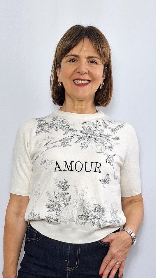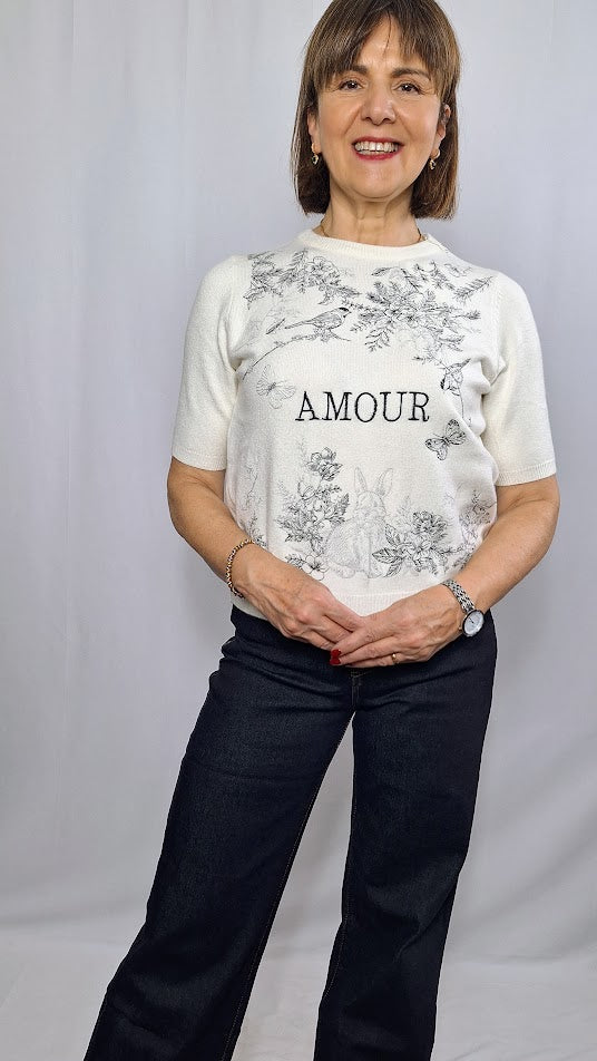 La Maglia "Amour" si distingue per i ricami raffinati e sottili che decorano il davanti con la scritta centrale "Amour". Realizzata in morbido cashmere e viscosa, presenta mezza manica, girocollo e un elastico sul fondo che ne valorizza la vestibilità all’altezza della vita, garantendo comfort e uno stile elegante.