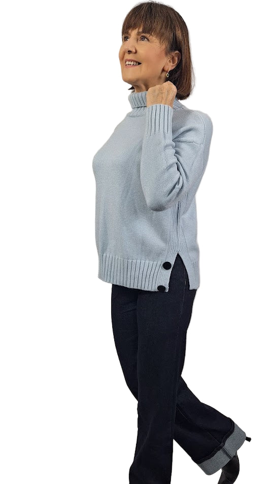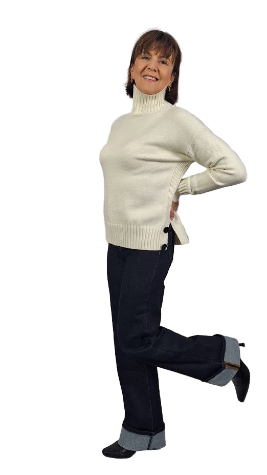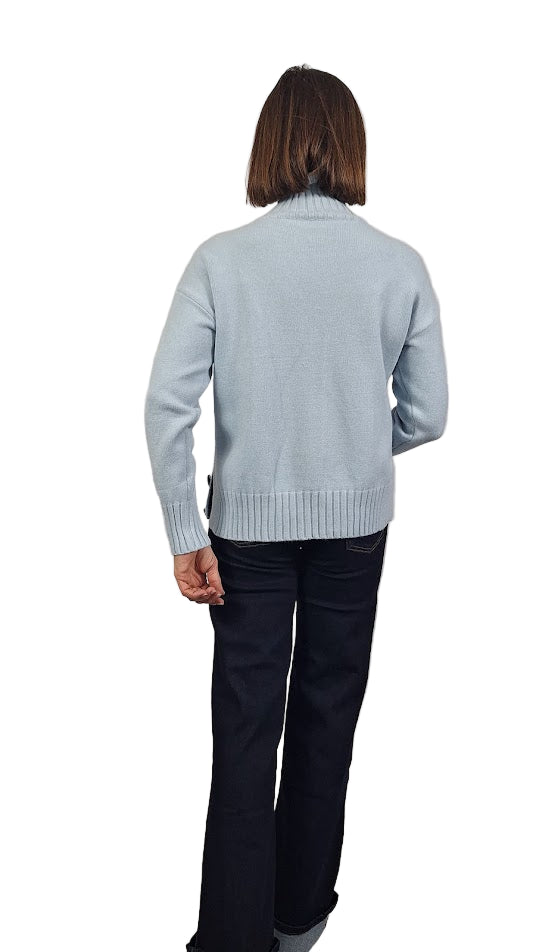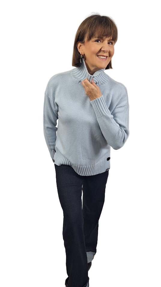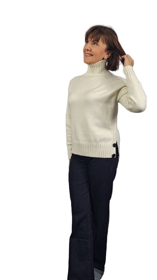 Maglia elegante in viscosa morbida che coniuga comfort e raffinatezza. Il collo alto a cratere in costa inglese 2X2 leggermente elastico, incornicia il viso con stile, mentre i polsini alti sempre a costa inglese 2X2 garantiscono una vestibilità precisa. Il modello a scatoletta, generoso e avvolgente, assicura una silhouette moderna e lusinghiera, la costa inglese 2X2 la troviamo anche sul fondo. I caratteristici spacchi laterali, completati da bottoni non funzionali, aggiungono un dettaglio sofisticato e permettono una vestibilità personalizzabile. Il tessuto caldo e morbido la rende ideale per le stagioni intermedie, perfetta per chi ricerca qualità e design consapevole.