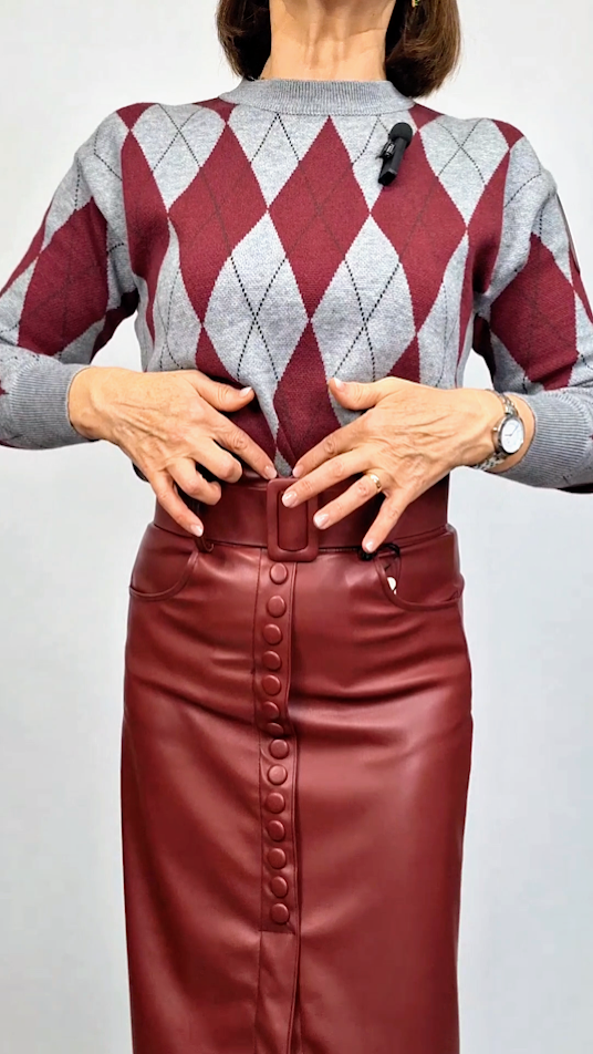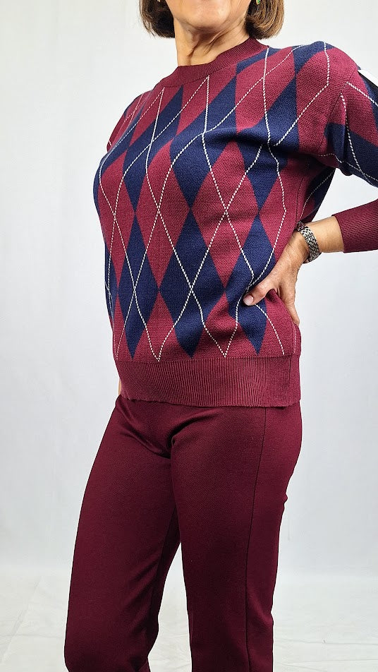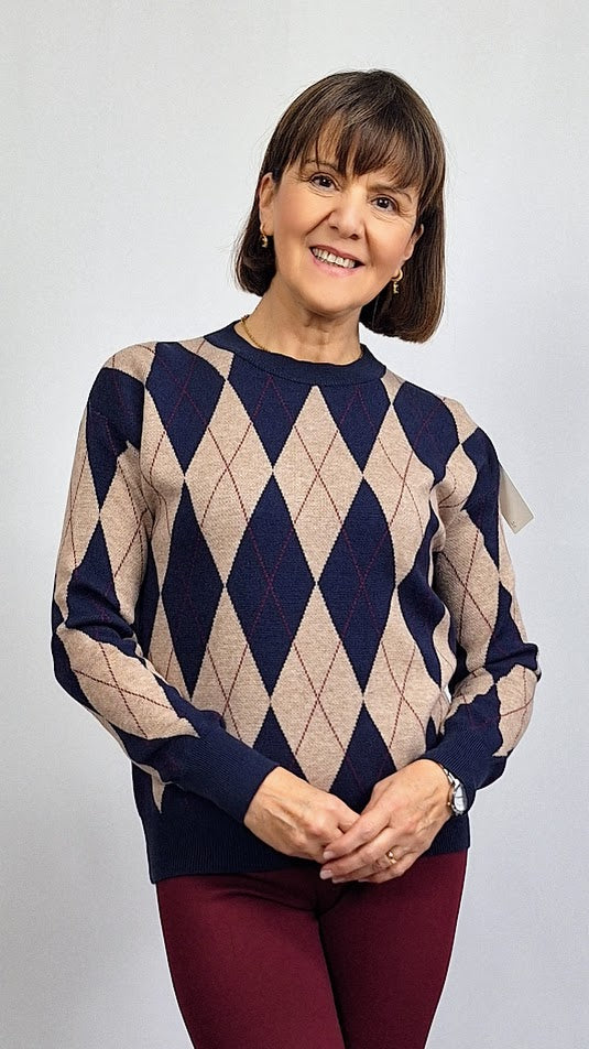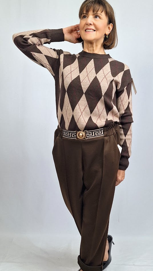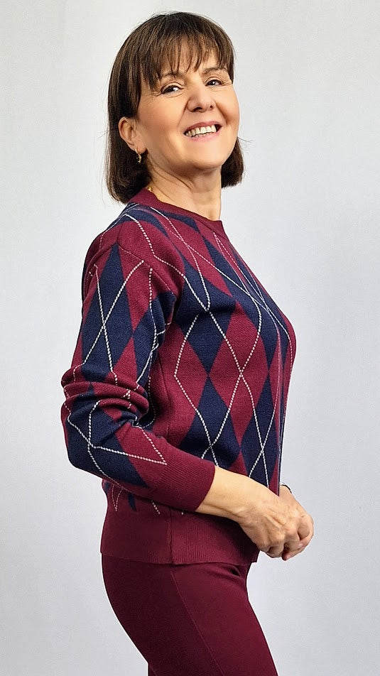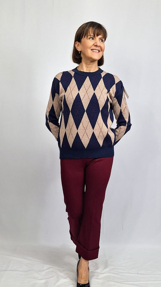 Maglia in viscosa dal drappeggio morbido e fluido, caratterizzata da un elegante motivo a rombi che cattura la luce con raffinatezza. Il girocollo classico garantisce versatilità negli abbinamenti, mentre le maniche sono rifinite con polsini elastici che assicurano una tenuta impeccabile. L'elastico inferiore modella la silhouette con precisione, creando una vestibilità ottimale che valorizza la figura senza compromessi sul comfort. Ideale per chi ricerca qualità costruttiva e dettagli curati.