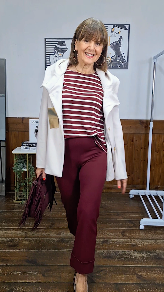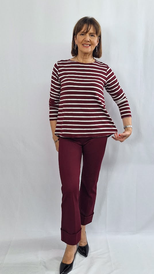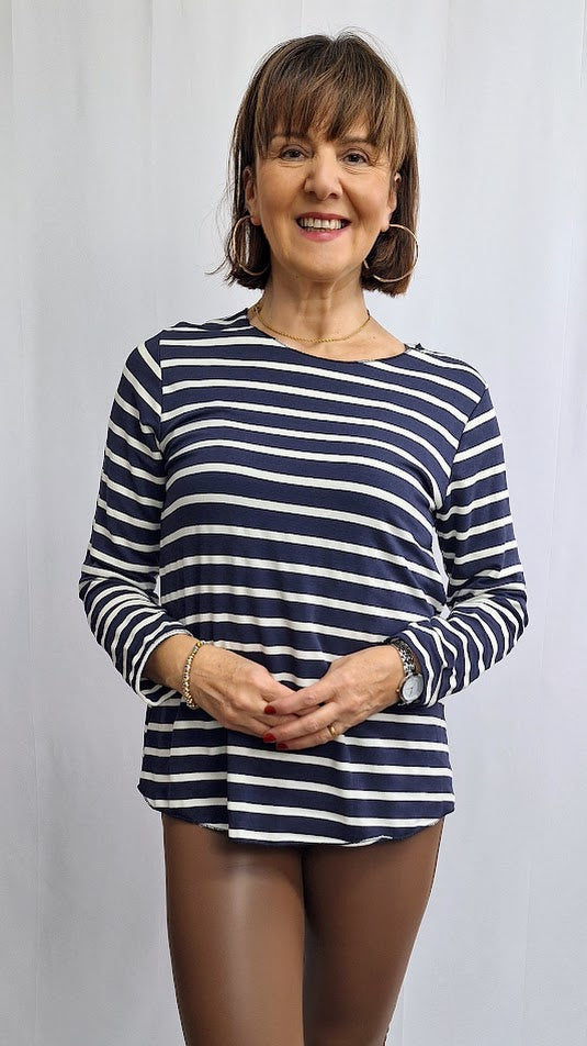 Questa maglia in misto cotone pesante a righe unisce comfort e funzionalità, ideale per la stagione autunnale. Il collo a barca e la manica lunga offrono una vestibilità elegante, mentre il fondo leggermente arrotondato garantisce un look moderno e versatile. Perfetta da indossare come sottogiacca o come t-shirt abbinata a jeans o longuette in satin, si adatta facilmente a diverse occasioni, con un equilibrio ottimale tra stile e praticità.