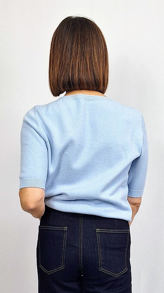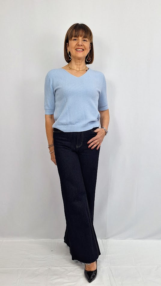 Questa maglia in morbida viscosa presenta uno scollo a V e mezza manica, ideale per essere indossata con comfort e stile. Il tessuto delicato non punge, rendendola perfetta sia come sottogiacca sia abbinata a un body per un look raffinato e versatile.
