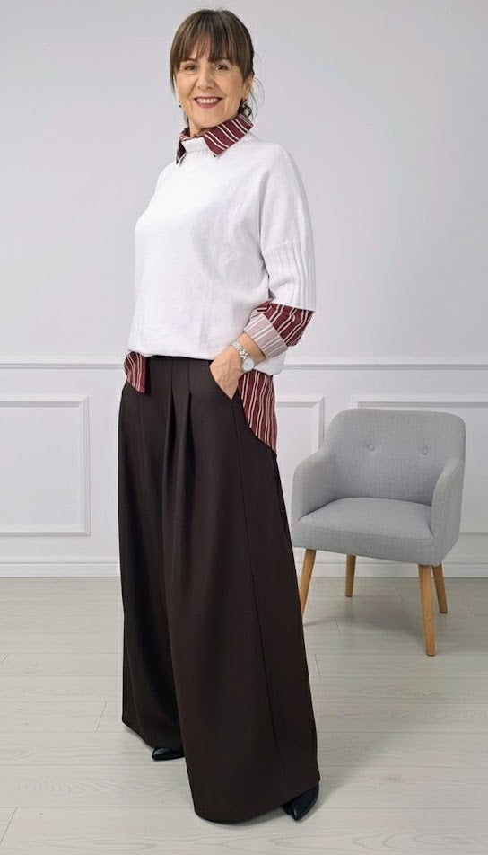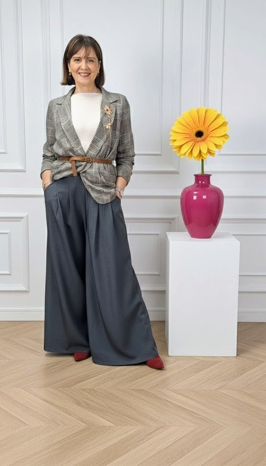 Il pantalone "Denise Palazzo" è realizzato in morbido poliestere per garantire comfort e fluidità nella silhouette. Presenta tasche alla francese per un tocco di praticità elegante, un elastico posteriore e cinturino in vita per una vestibilità perfetta e personalizzabile. Le pince anteriori donano morbidezza e definizione alle linee, rendendo il capo impeccabile sia per occasioni formali che per il quotidiano.