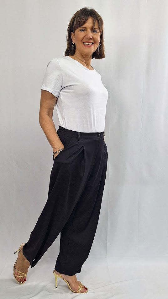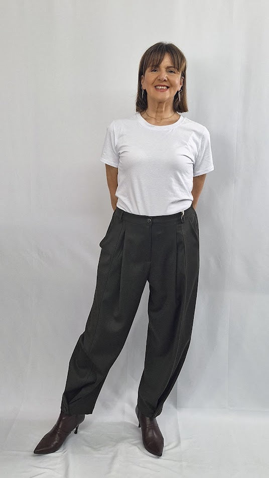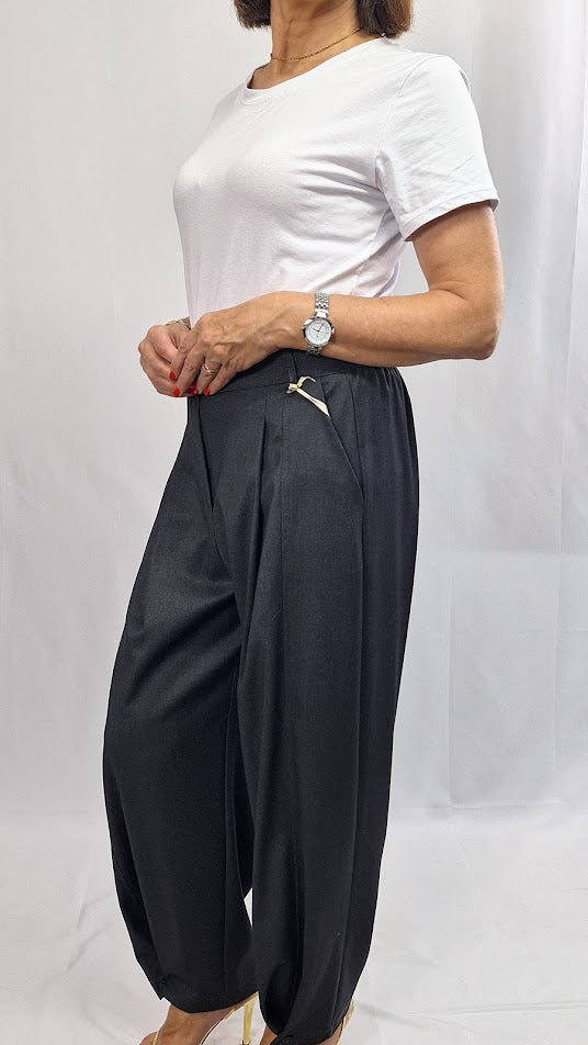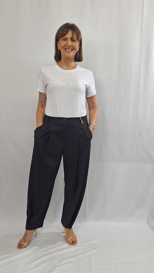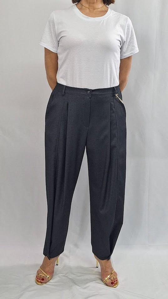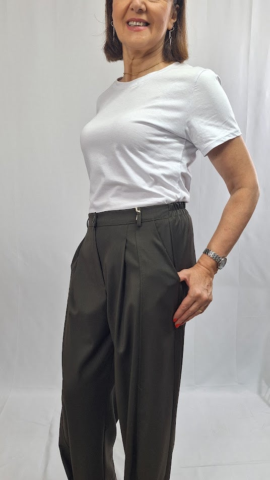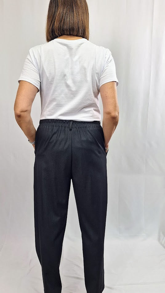 Questi pantaloni "Mia" si distinguono per la loro struttura curata: elastico sul retro, bustino anteriore con zip e bottoncino per una vestibilità confortevole e sicura. Caratterizzati da tasche alla francese e da un piegone lungo che si chiude sul fondo con bottoncino, assicurano un aspetto elegante e definito. Realizzati in un tessuto morbido e leggero con una mano di fresco lana, garantiscono comfort e stile anche nella stagione più calda. Vestibilità ottima fino alla taglia 50, un capo imprescindibile nel guardaroba.